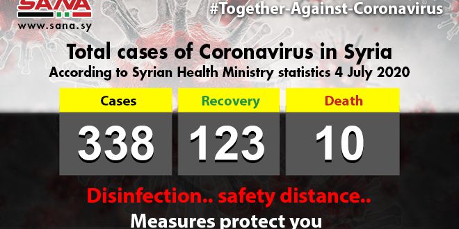 The ministry said in a statement to SANA that the number of coronavirus cases registered in Syria reached 338, of which 123 have recovered while 10 cases have passed away.