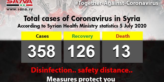 The ministry said in a statement to SANA that the total number of coronavirus cases registered in Syria reached 358, of which 126 have recovered and 3 cases have passed away.