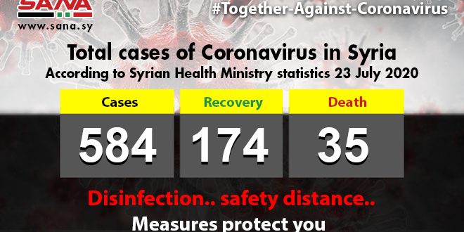 The Ministry said in a statement that number of infections in Syria have reached 584, of which 174 recovered and 35 have died.