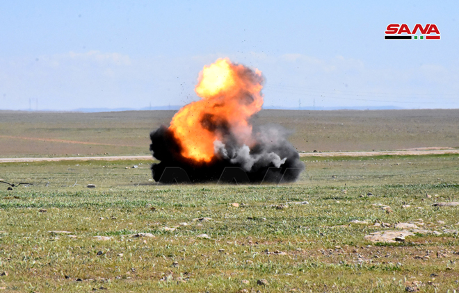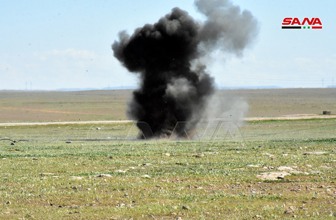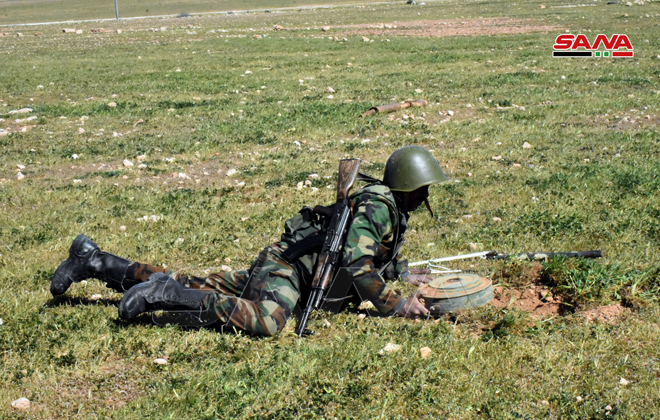 Hama, SANA – Syrian Arab Army units carried out a wide combing campaign to dismantle IEDs and mines left behind by terrorists in large areas in Salamiyah countryside and al-Badiyah areas in the northeastern sector of Hama province , which claimed the lives of several civilians.