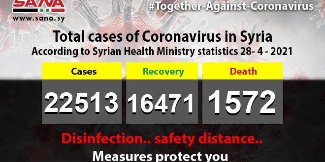 The Ministry, in a statement to SANA, on Wednesday said that the total number of infections has amounted to 22,513, of which 16,471 have recovered and 1,572 have passed away.