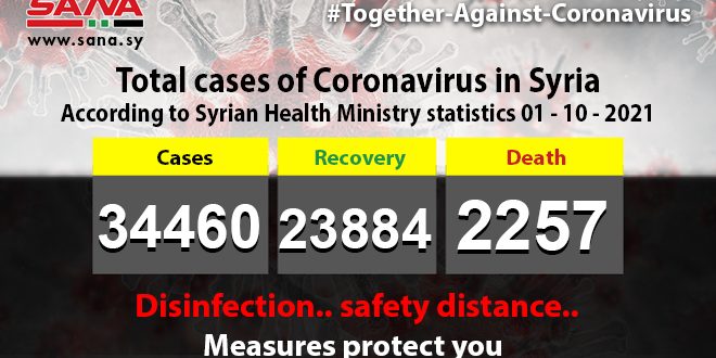 The Ministry added on Friday that the total number of the reported coronavirus cases in Syria has reached up to 34,460, of which 23,884 have recovered, while 2,257 have passed away