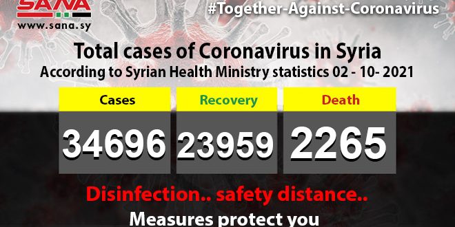 In a statement to SANA, the Ministry pointed out that the total number of the registered cases in Syria have reached up to 34,696, of which 23,959 have recovered, while 2,265 have passed away.
