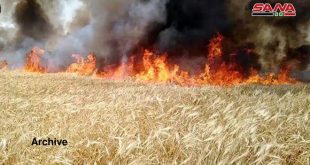 Hasaka, SANA_ Large areas of wheat and barley fields in Hasaka countryside were burned down by a fire broke out near a Turkish occupation point in the countryside of Ras …