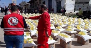 Hama, SANA La Media Luna Roja Árabe Siria MLRAS distribuyó canastas de alimentos a los civiles residentes en la ciudad de Halfaya, en el norte de la provincia central de …