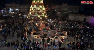Hama, SANA Se encendieron las luces de un gigante árbol de Navidad de 28 metros de altura, en la plaza de la ciudad de Kaferbehem, en la provincia central siria …
