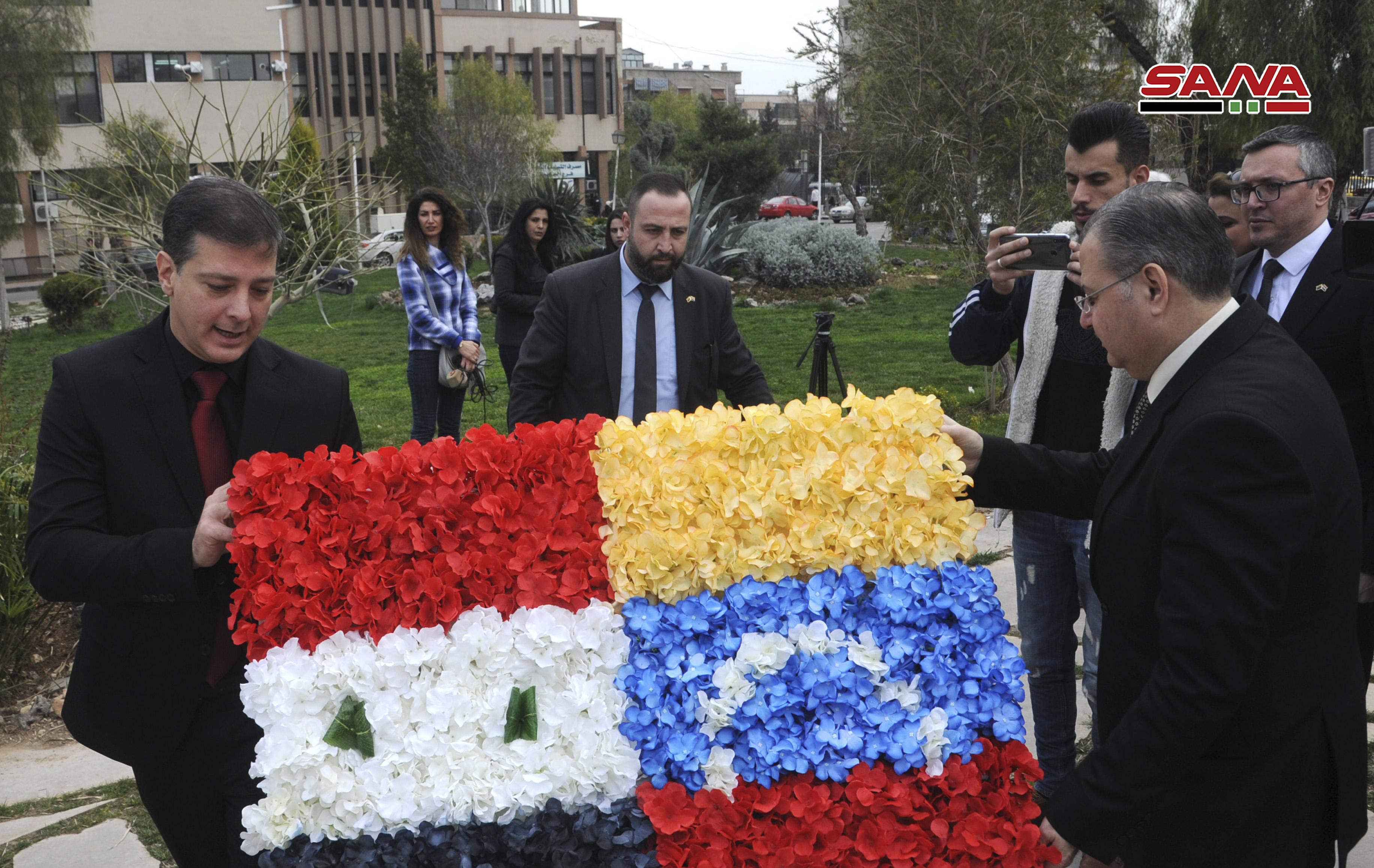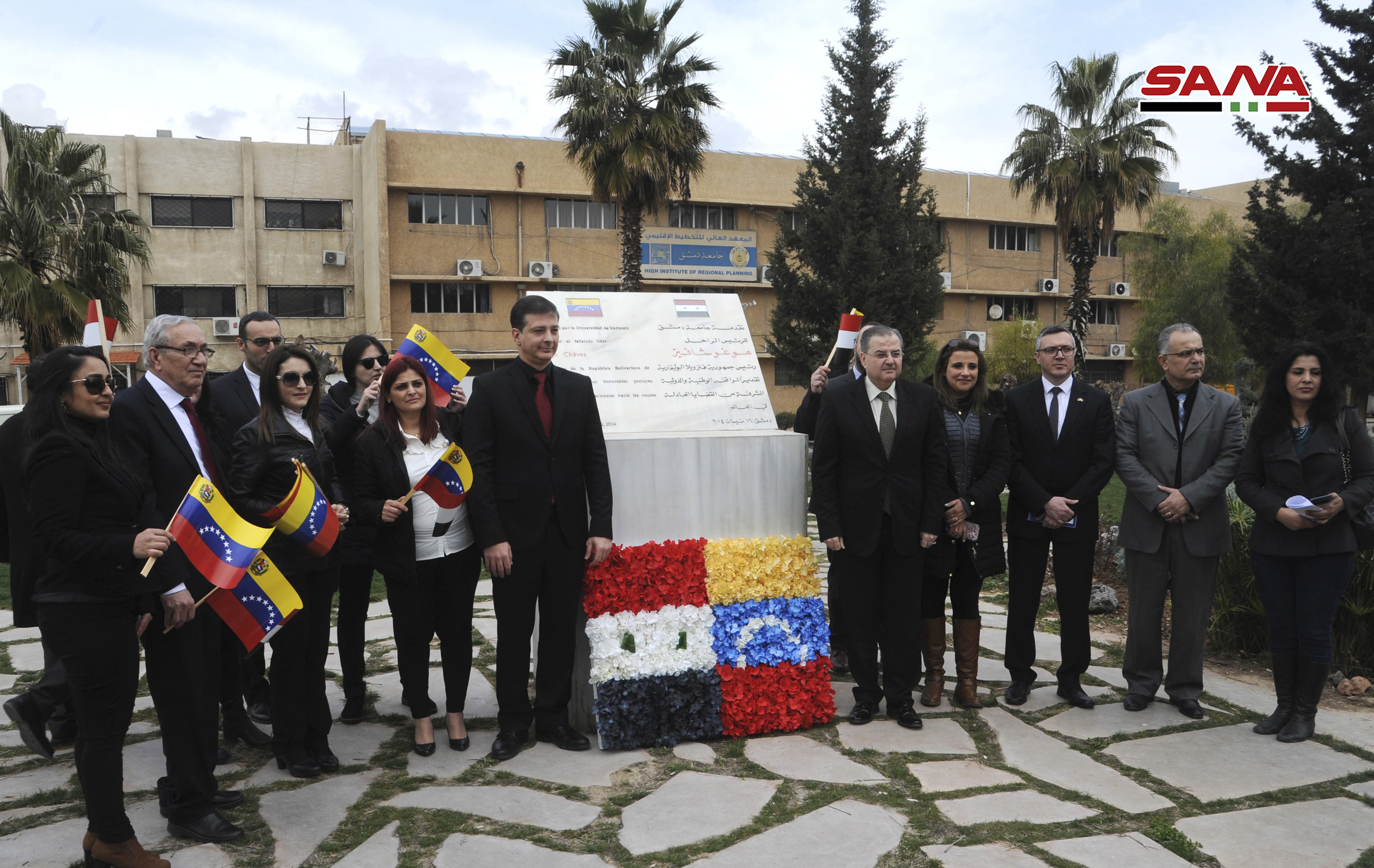 El embajador de la República Bolivariana de Venezuela, José Gregorio Biomorgi, acompañado por el cuerpo diplomático, y el rector de la Universidad de Damasco, Mohamad Maher Qabaquibi, colocaron una ofrenda floral en el monumento conmemorativo del líder Chávez instalado en el jardín de la Universidad de Damasco, como gratitud al gran legado del Comandante Eterno.