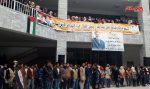 Asimismo, la gente levantó pancartas en las escribieron frases en contra de la barbaridad y arrogancia de EEUU, y afirmaron que “Israel” es un ente usurpador ilegal.