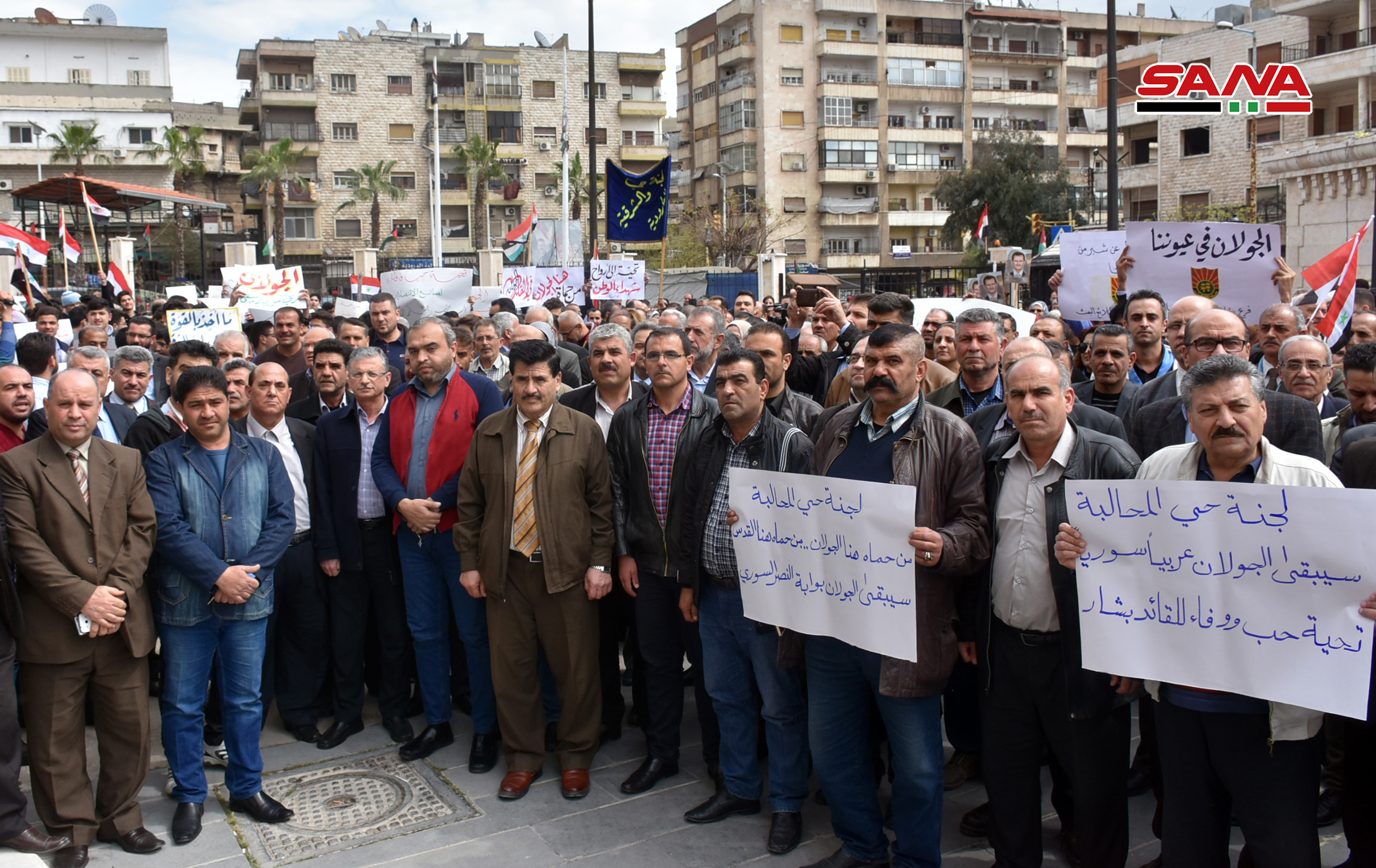 “Ni Trump ni otra parte tiene derecho a conceder privilegios al ente israelí en el Golán sirio ocupado” gritaron los habitantes de la ciudad septentrional de Alepo quienes se concentraron en la plaza central de Abulah al-Yabiri para manifestar su apoyo a nuestros compatriotas en el territorio sirio ocupado.