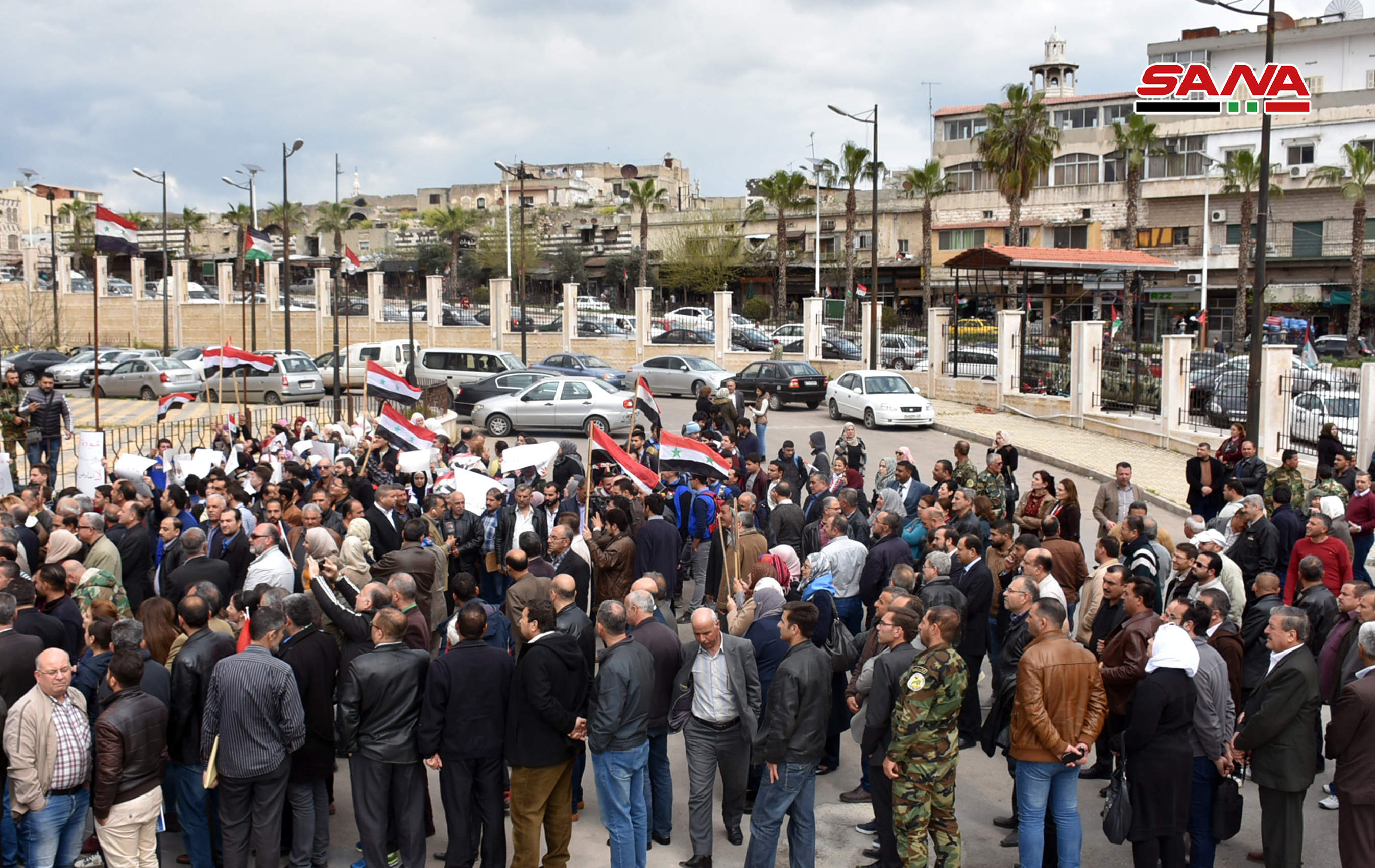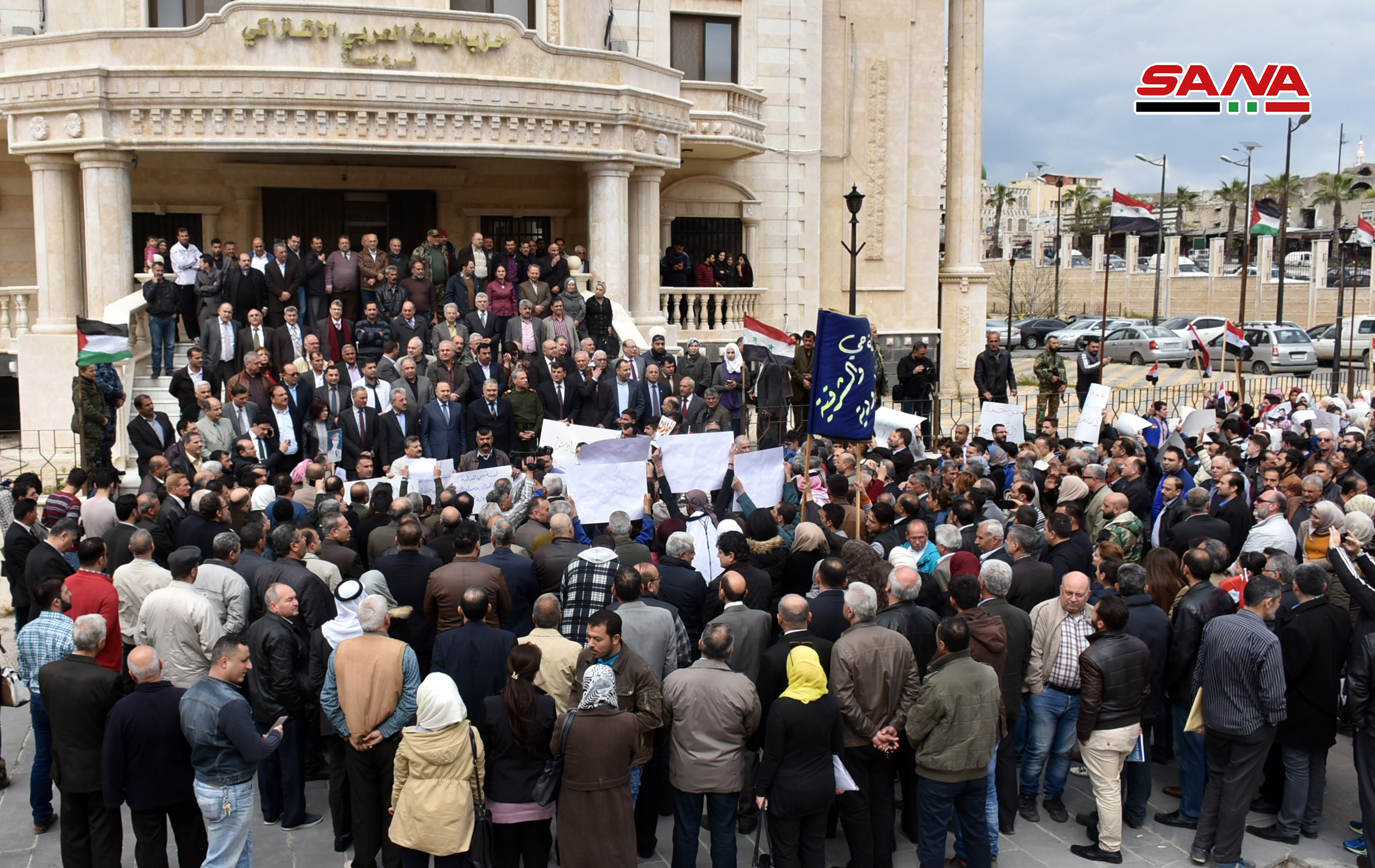 En la ciudad de Sweida, se organizó una concentración frente al edificio de la Gobernación para denunciar la decisión estadounidense y reafirmar que el Golán es árabe sirio.