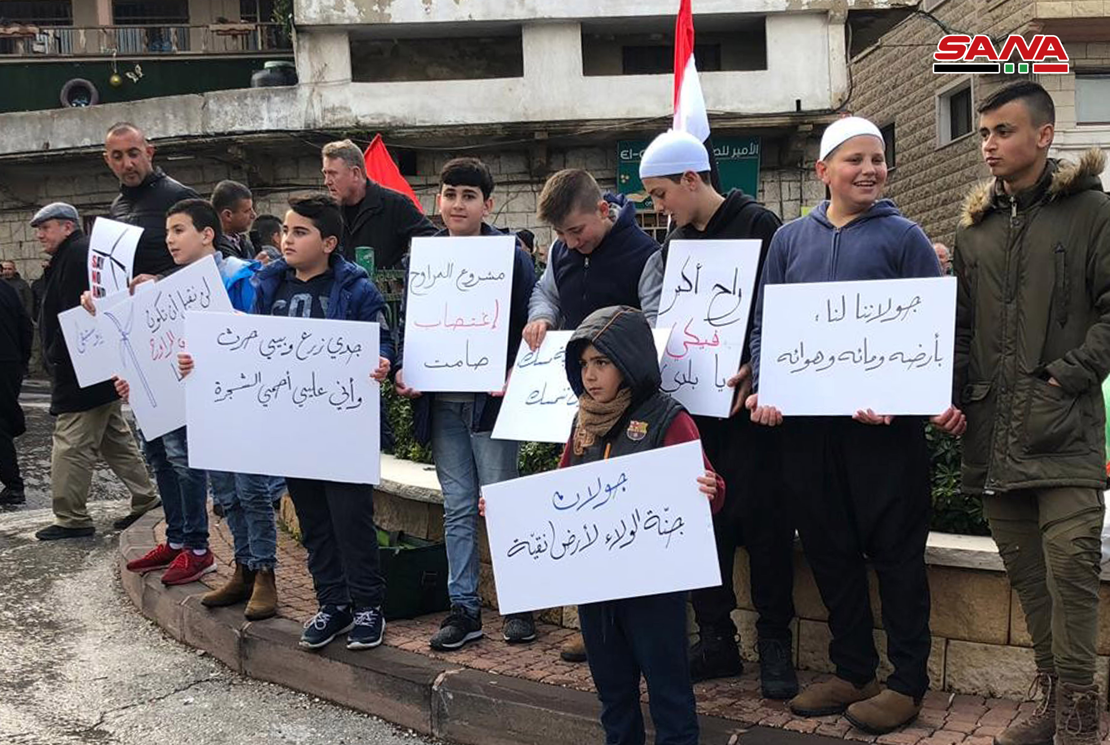 Nuestros compatriotas en el Golán sirio ocupado organizaron este martes un acto de protesta en la plaza de al-Shuhadaa en la localidad ocupada de Maydal Shams para reiterar su rotundo rechazo a la proclamación del presidente de EEUU, Donald Trump, sobre su propia tierra.