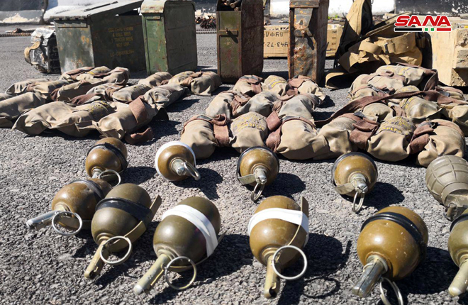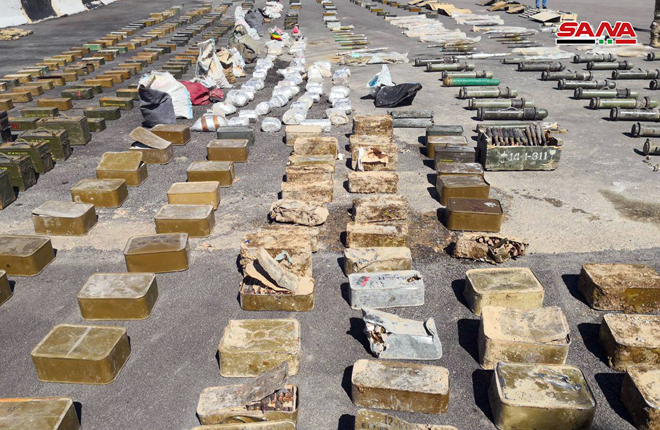 Las autoridades competentes hallaron durante sus operaciones de rastreo y desminado en la zona de Ghouta Oriental al este de Damasco, un escondite en el que los terroristas almacenaban armas y municiones.