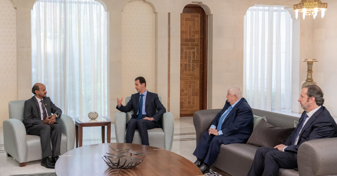 El presidente Bashar al-Assad, recibió hoy las cartas credenciales del Dr. Hafiz Rahman, como Embajador de la República de India, y de Fabio Vaz Pitaluga, como Embajador de la República Federal de Brasil, ante la República Árabe Siria.