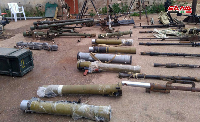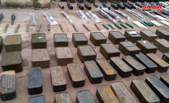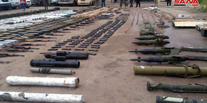 Los uniformados sirios encontraron armas y municiones durante sus operaciones de peinado en las zonas liberadas del terrorismo en el campo oeste de la provincia de Deraa, en el sur del país.