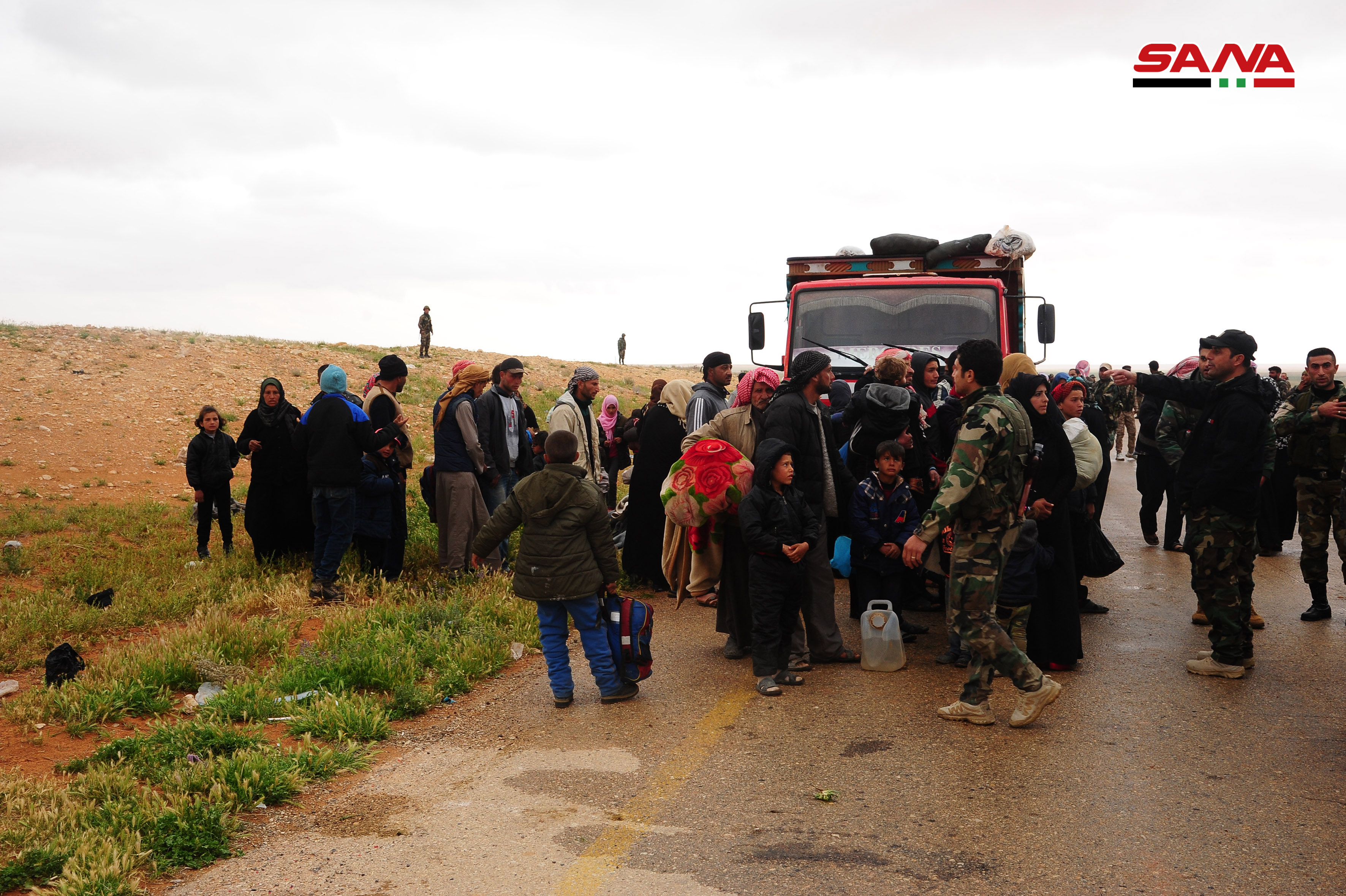 Autobuses enviados por las autoridades sirias trasladaron las familias desplazadas a centros de refugio temporal en Homs para que luego se dirijan a sus poblados liberados del terrorismo por el ejército sirio.