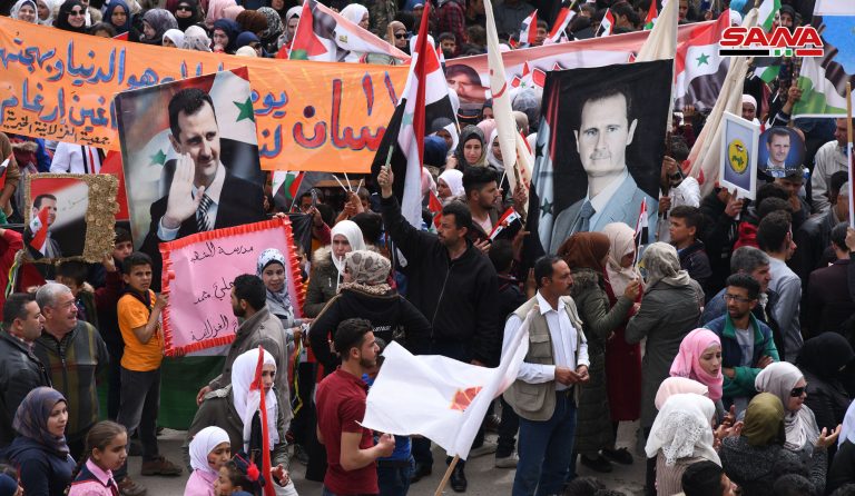 “Siria seguirá siendo libre, soberana y digna gracias a la firmeza y voluntad de su pueblo y los sacrificios de su ejército que derrotó el terrorismo”, afirmaron algunos manifestantes.