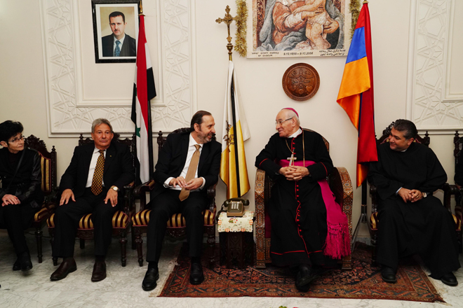 El ministro Azzam visitó también la iglesia de Mar Sarkis, adscrita al arzobispado de los Armenios Ortodoxos y expresó las felicitaciones del presidente al-Assad a su beatitud el cardinal Armash Nalpendian arzobispo de Damasco, y a Yussef Arnautti obispo de los Armenios Católicos por las Pascuas.