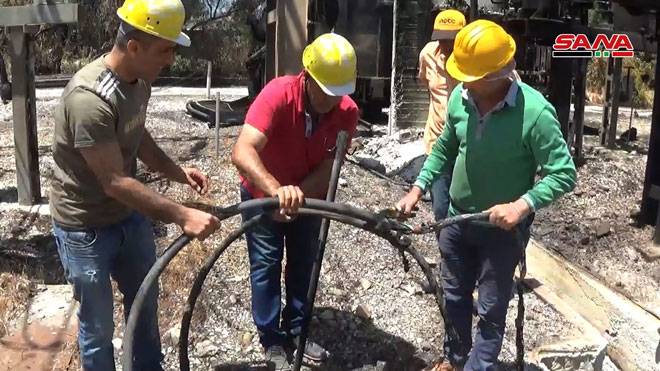 Inmediatamente después de la liberación de la localidad de Shariyah en la provincia de Hama del terrorismo, los trabajadores y técnicos de la Empresa de Electricidad de Hama accedieron al poblado y comenzaron la rehabilitación y reparación de las instalaciones del sistema eléctrico.