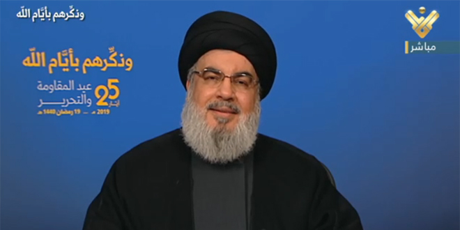 En un discurso por el 19º aniversario del Día de Resistencia y Liberación, Nasrallah resaltó el rol de Siria e Irán en los triunfos de la resistencia y la liberación del sur del Líbano en 2000.