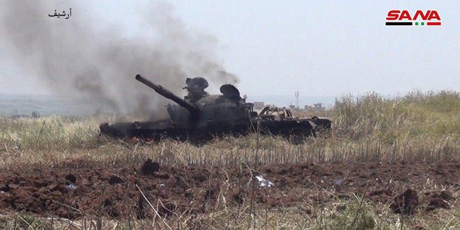 Unidades del ejército ocasionaron con artillería y cohetes pérdidas humanas y materiales en las filas terroristas del Frente al-Nusra y sus filiales en los campos de Hama e Idleb en respuesta a sus agresiones.