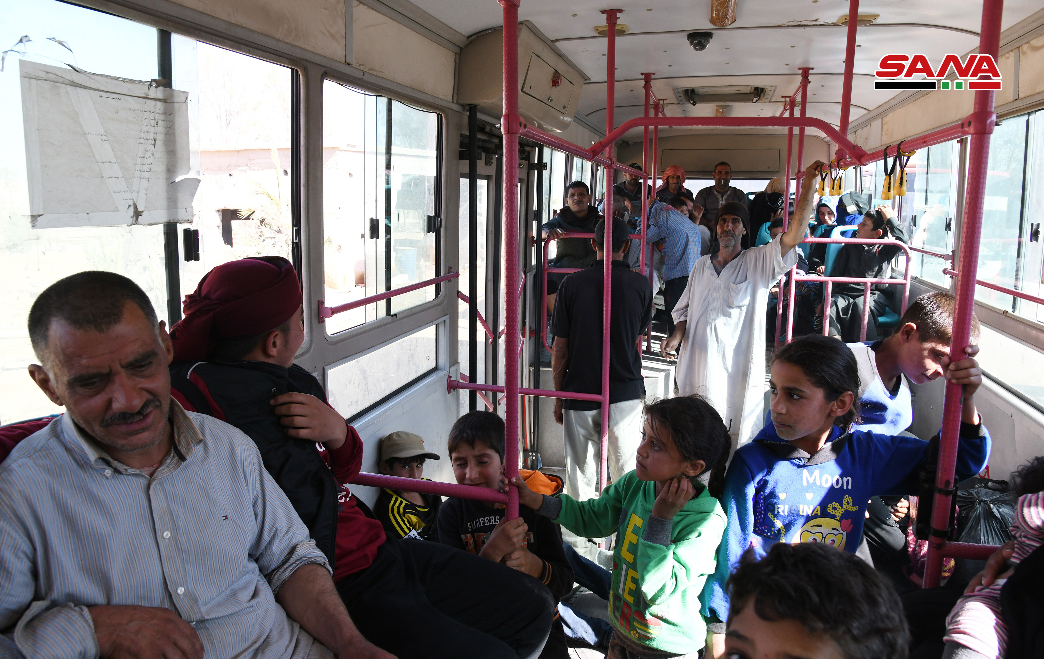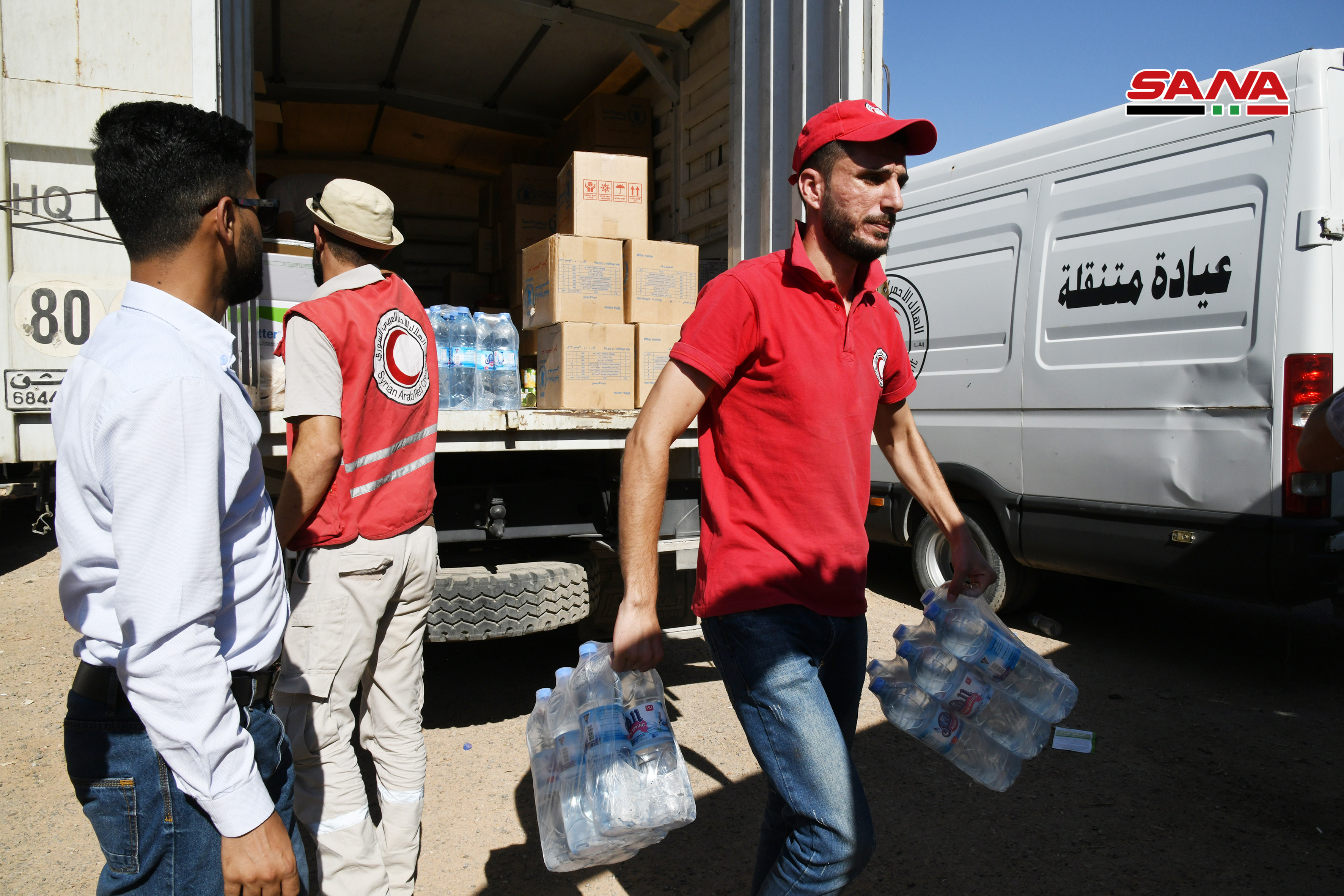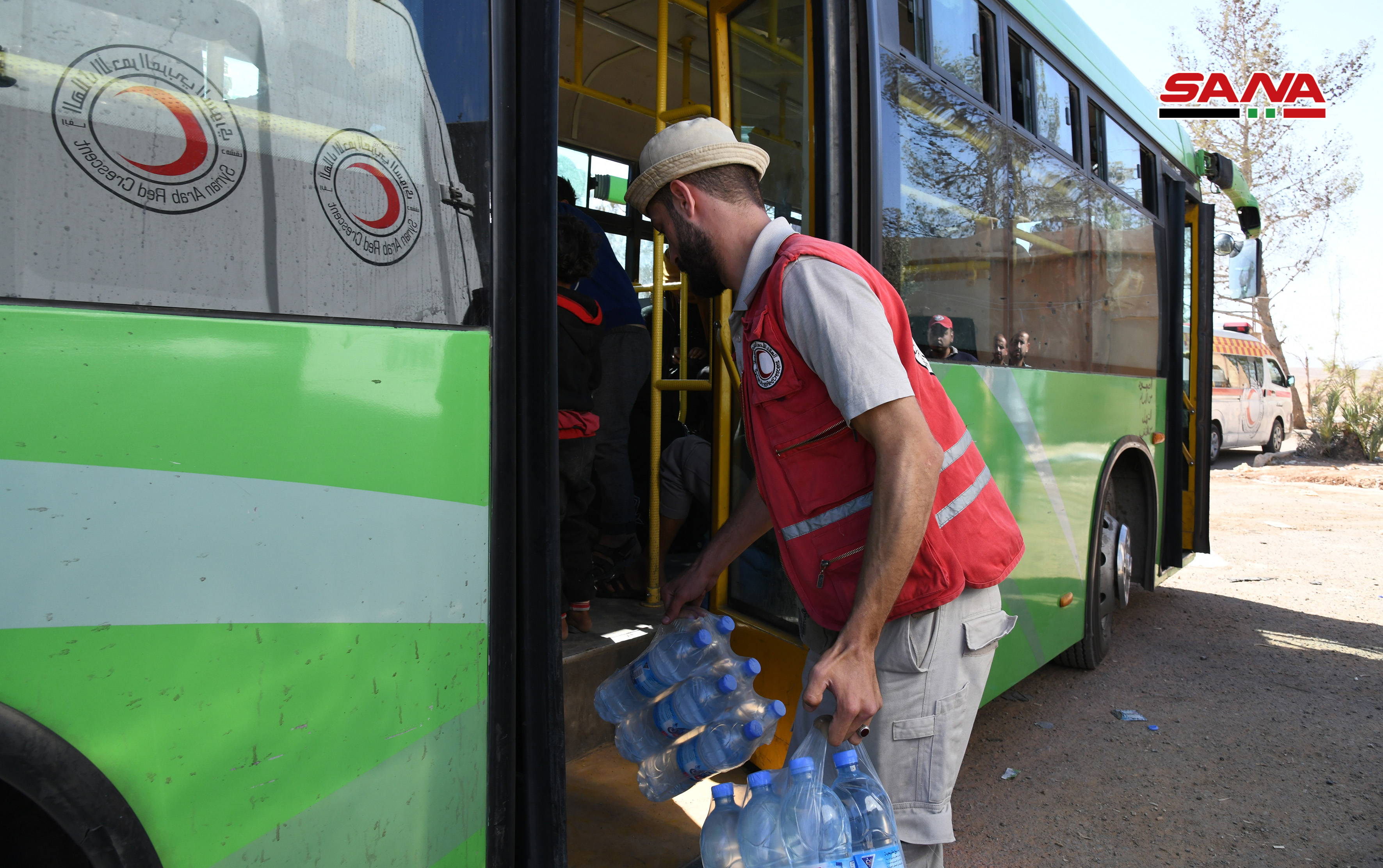 Los voluntarios de la Media Luna Roja Árabe Siria y los equipos médicos prestaron a los desplazados alimentos y atención médica, y luego fueron trasladados en autobuses a centros de residencia temporal en la provincia de Homs para luego dirigirse a sus poblados de origen.