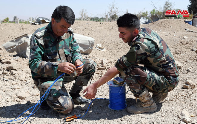 Bassem Rifai, un empleado del Establecimiento General de Geología, se salvó de una muerte segura cuando estalló una mina remanente del Daesh mientras se desplazaban él y tres de sus colegas hacia su centro de trabajo en la zona de Abu Shamat al este de la ciudad de Dmeir (campiña nororiental de Rif Dimashq).