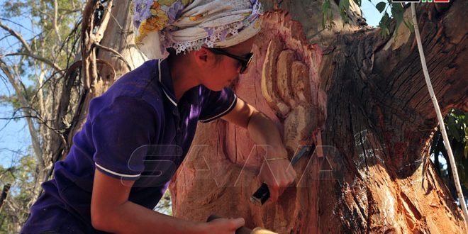 Junto a los pintores está un grupo de escultores que cavan en los troncos secos de los árboles, esculturas que representan varias piezas arqueológicas del Museo Nacional de Damasco.