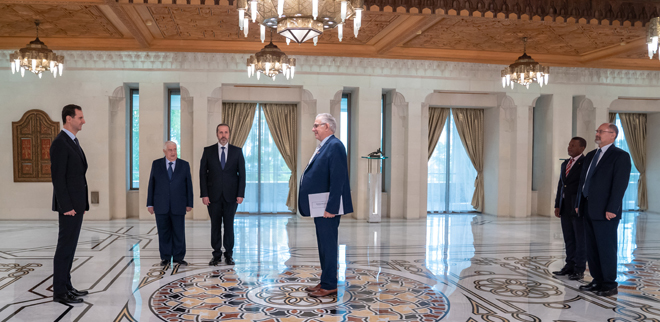 A la ceremonia de entrega de las credenciales, asistió el Viceprimer ministro y Ministro de Exteriores y Emigrantes, Walid al-Moallem, y el ministro de Asuntos Presidenciales, Mansour Azzam.