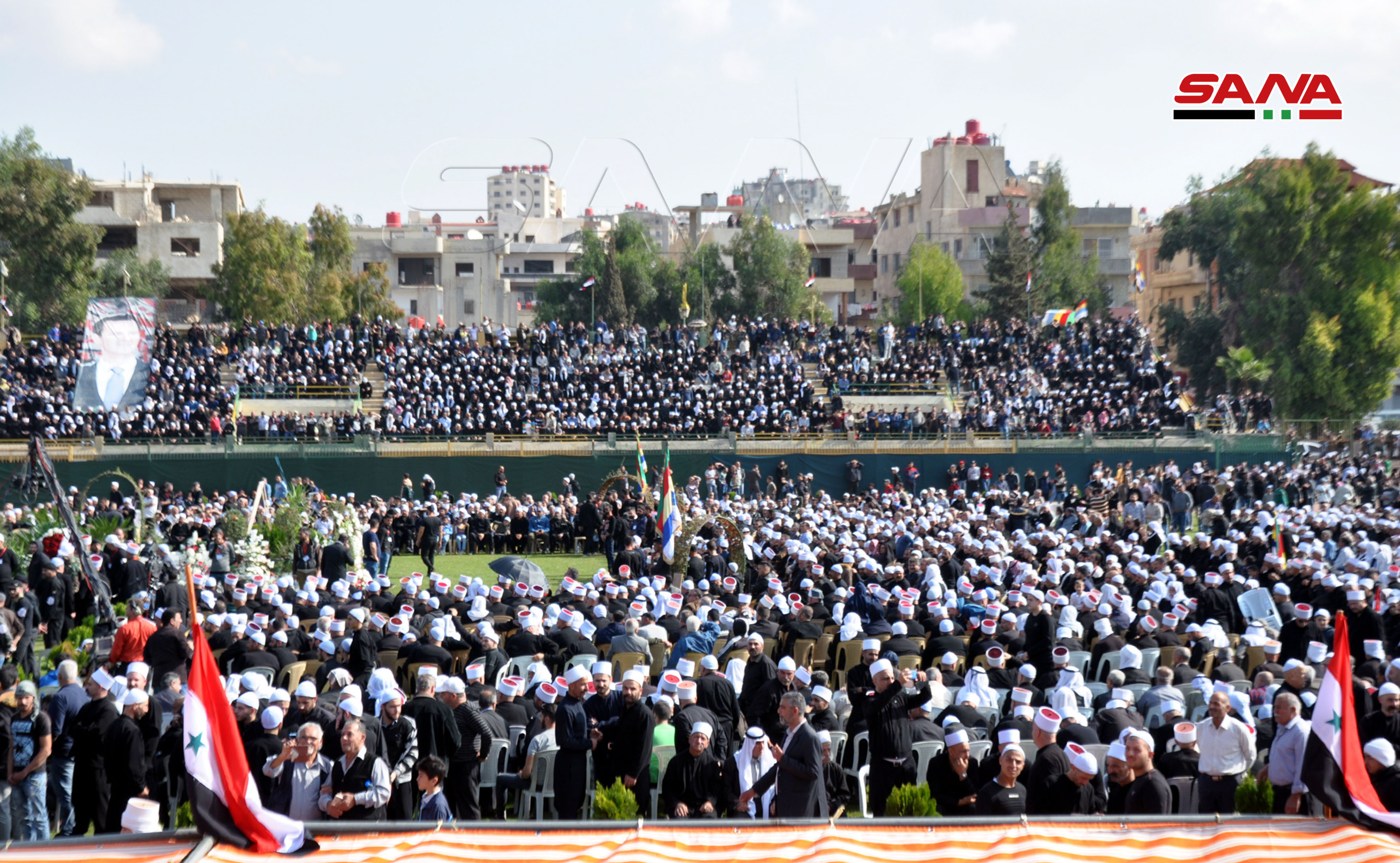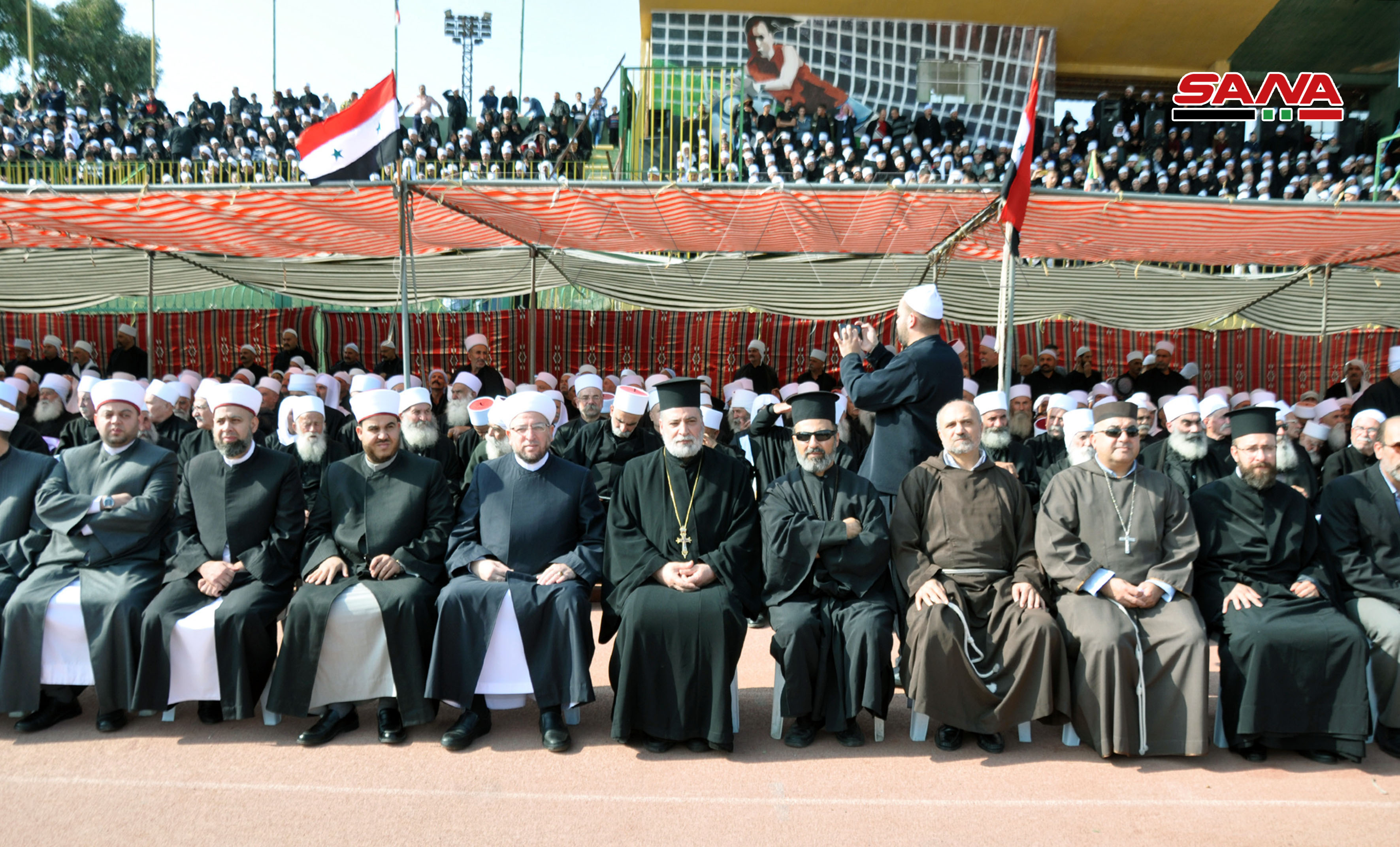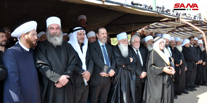 El ministro Azzam asistió a una ceremonia fúnebre efectuada en el estadio de la ciudad de Sweida con la participación de una multitud de figuras religiosas, sociales y oficiales.