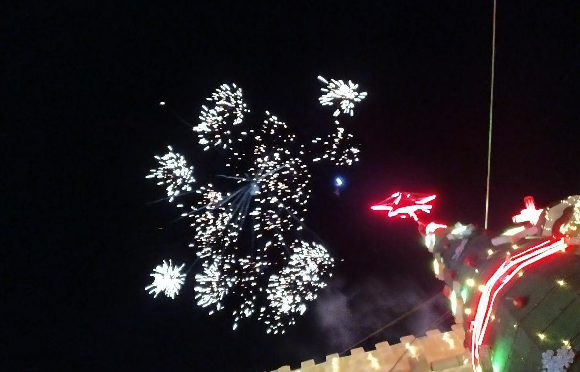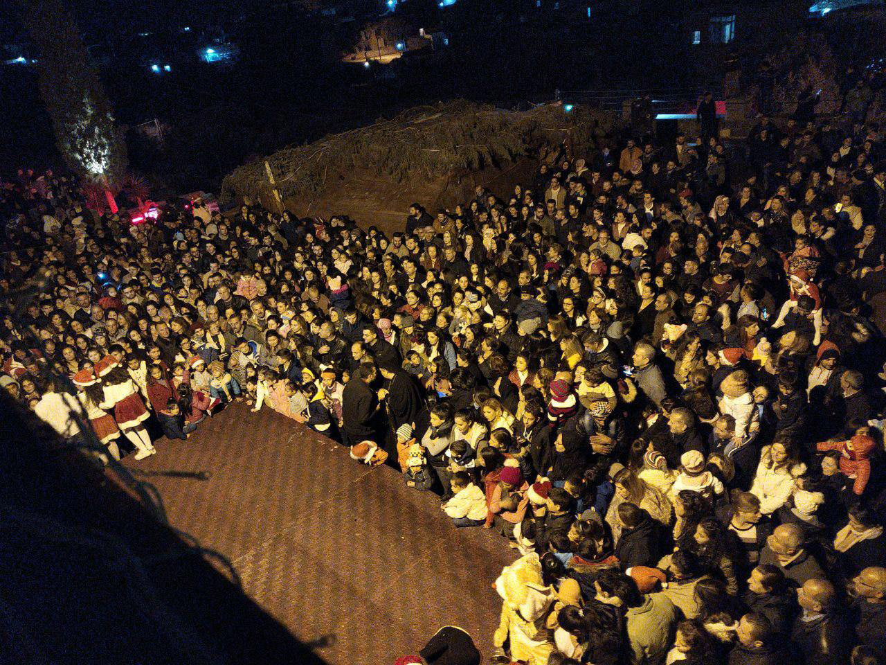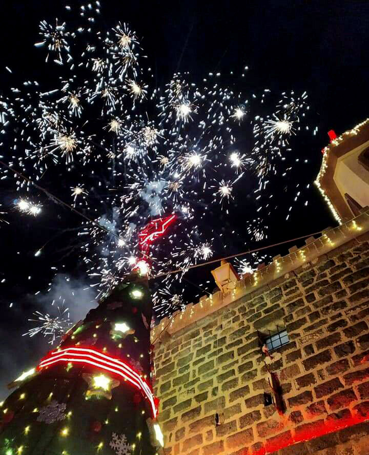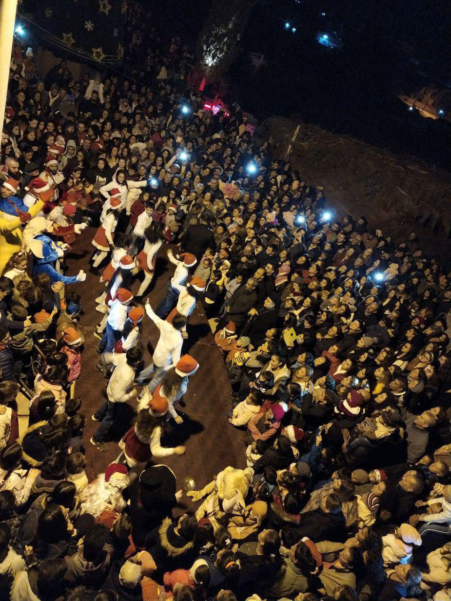 El árbol de Navidad fue iluminado al sonido de las campanas de la iglesia, los fuegos artificiales y las notas musicales interpretadas por la banda de la ciudad de Khabab.
