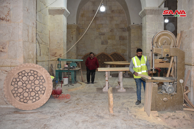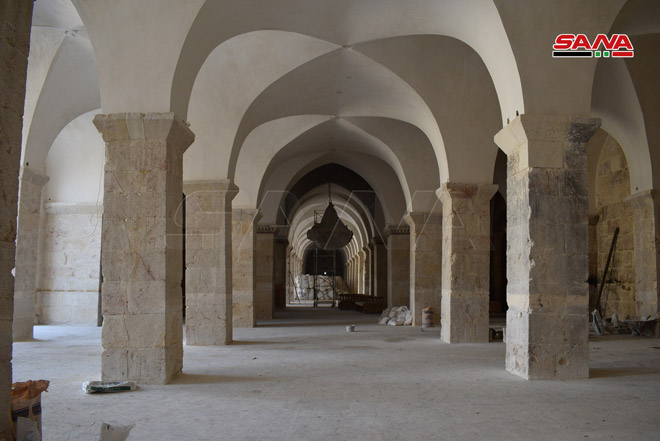 Desde la liberación de la ciudad del terrorismo a manos de los héroes del Ejército Árabe Sirio hace tres años, equipos de constructores especialistas realizan obras de restauración para levantar las secuelas del terrorismo de dicha mezquita.
