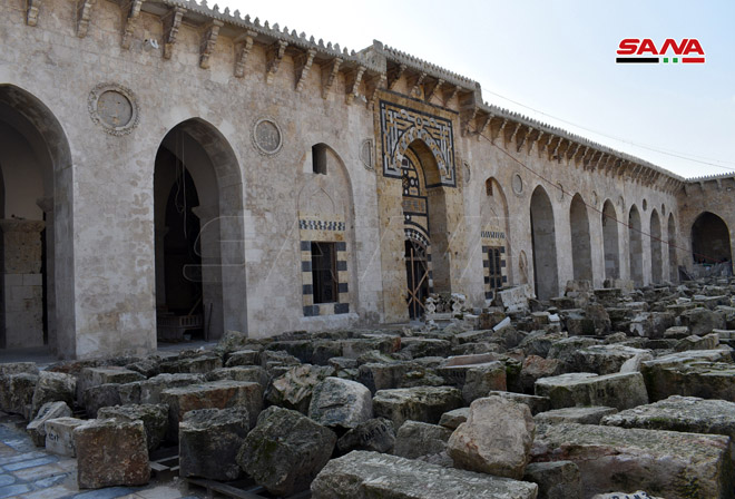 La emblemática mezquita Omeya en la ciudad de Alepo sufrió graves daños a consecuencia de los actos terroristas que destruyeron su famoso minarete y perjudicaron sus fachadas de piedra y techos de madera, y al mismo tiempo todo su contenido fue dañado.