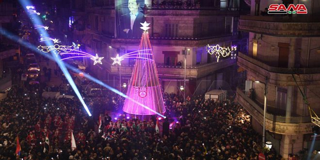 En la plaza del vecindario Azizieh de la ciudad norteña de Alepo, se encendieron las luces de un gigante Árbol de Navidad en una ceremonia organizada por la Asociación Cultural Kelikia.