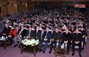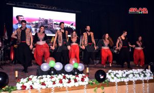 El evento incluyó recitales de canciones patrióticas y homenaje a varias familias de mártires, en el teatro del Sindicato de Artistas en Alepo.