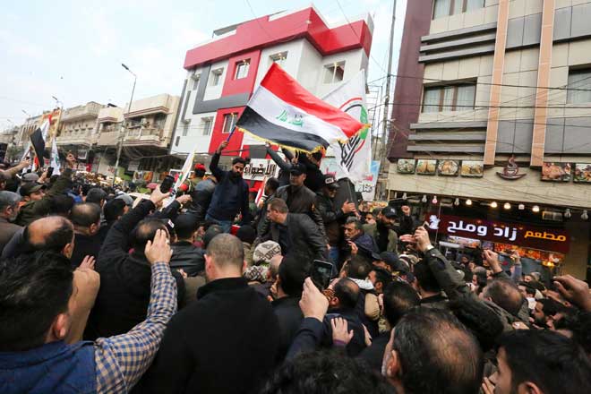 Las multitudes participantes en la procesión fúnebre en el barrio Kazimiyya de Bagdad, gritaron consignas que condenan la agresión estadounidense.