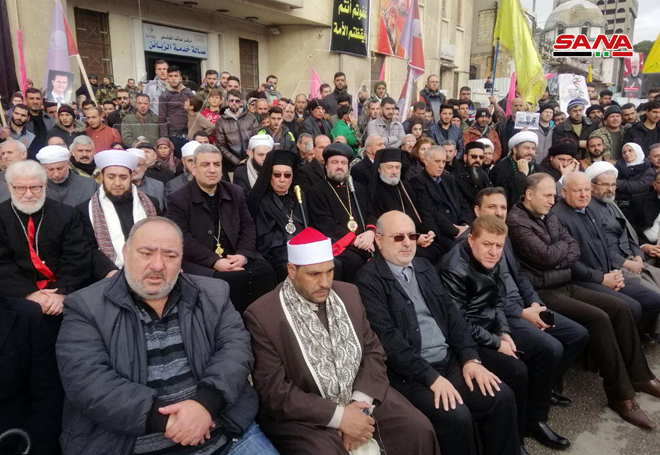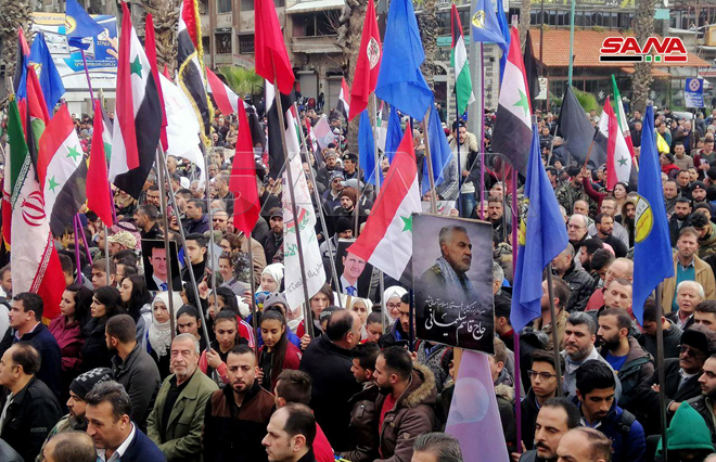 La emblemática plaza del Nuevo Reloj de la ciudad de Homs en el centro de Siria, fue escenario de una masiva manifestación en condena al crimen perpetrado por EE.UU cerca del aeropuerto de Bagdad y que llevó al martirio del teniente general Qassem Soleimani, comandante de la Fuerza al-Quds, y de Abu Mahdi Al-Muhandes, Subcomandante de las Unidades de Movilización Popular de Irak, y otros resistentes.