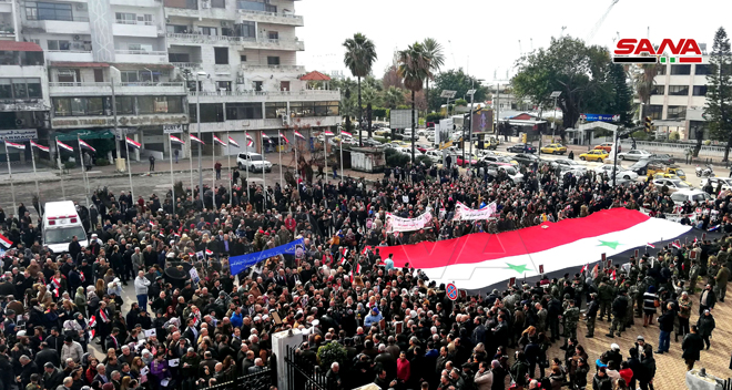 Miles de sirios se congregaron hoy en la plaza de la gobernación de la ciudad costera siria de Latakia para condenar el crimen perpetrado por EE.UU cerca del aeropuerto de Bagdad y que llevó al martirio del teniente general Qassem Soleimani, comandante de la Fuerza al-Quds, y de Abu Mahdi Al-Mahndes, Subcomandante de las Unidades de Movilización Popular de Irak, y otros resistentes.