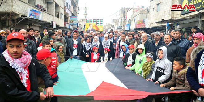 Los participantes en el acto izaron banderas de Siria y Palestina, y pancartas que denuncian la declaración por parte de Trump al “acuerdo del siglo”, en una violación a las leyes internacionales.