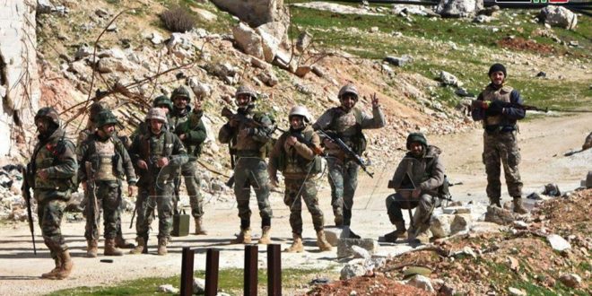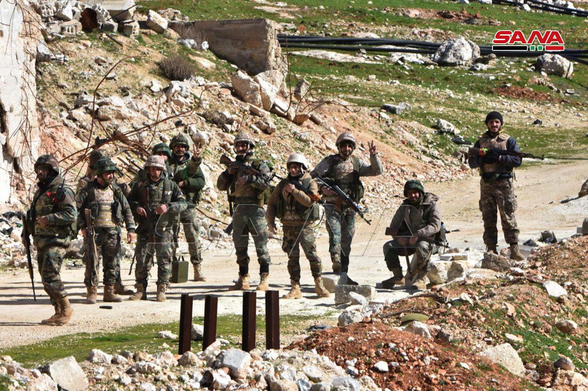 Unidades del ejército árabe sirio completaron su despliegue en la colina estratégica de al-Eis en el campo sureño de Alepo después de derrotar a las organizaciones hostiles y peinar el área de remanentes explosivos.