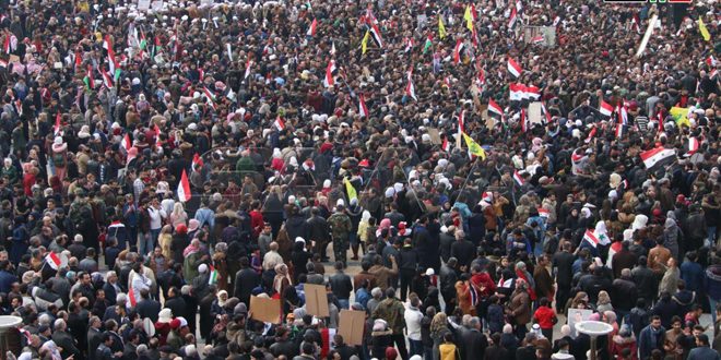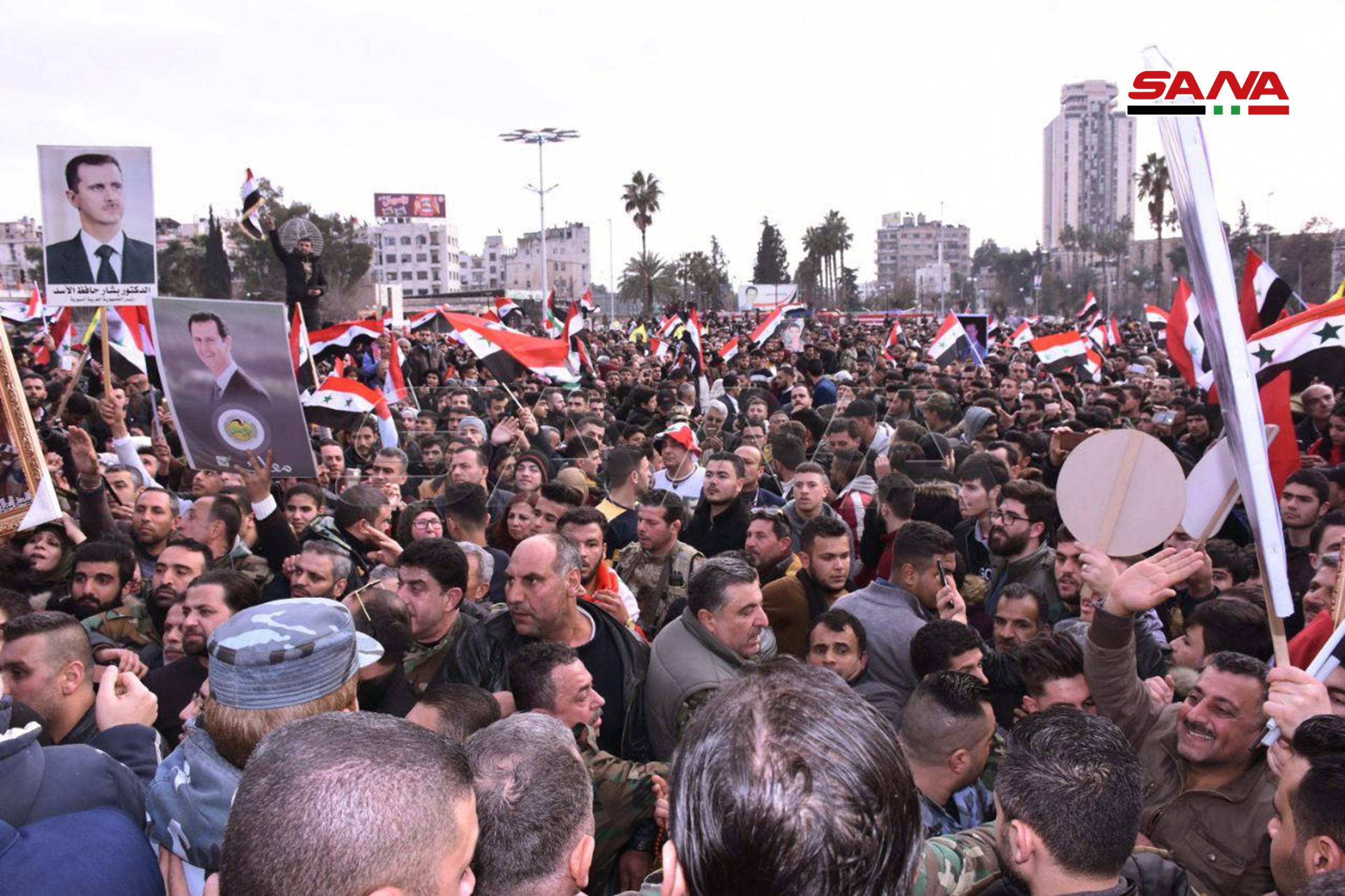 Los congregados izaron banderas nacionales y gritaron consignas que alaban la victoria del Ejército en Alepo y sus cercanías.