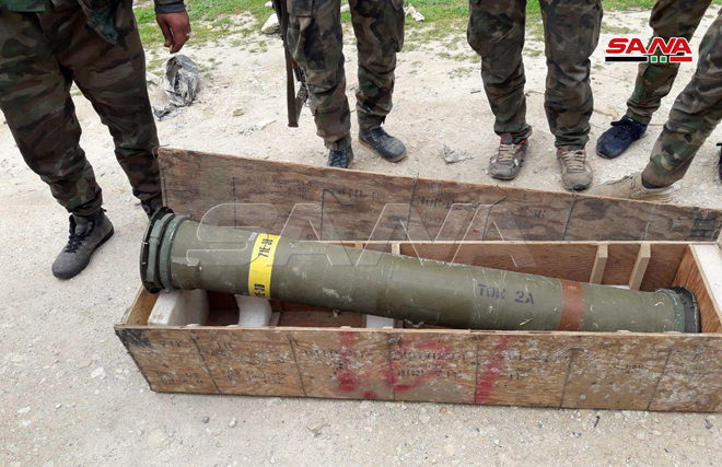 Según declaró un comandante en el ejército a SANA, durante las operaciones de peinado en la ciudad de Saraqueb, se encontraron misiles anti-blindados “TOW” de fabricación estadounidense y fueron utilizados por los terroristas contra los vehículos blindados del ejército árabe sirio.