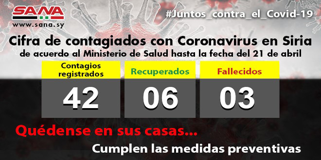 “El número total de casos registrados en Siria hasta la fecha alcanzó 42 casos, seis de los cuales se recuperaron, mientras tres perdieron la vida”, aclaró el Ministerio en un comunicado.