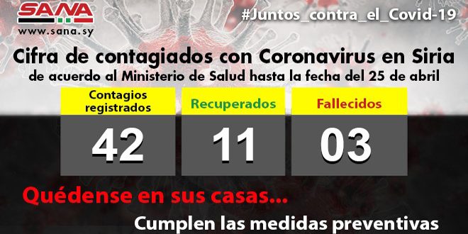 “El número total de casos registrados en Siria hasta la fecha se mantiene en 42, 11 de los cuales se recuperaron, mientras tres perdieron la vida”, aclaró el Ministerio en un comunicado.