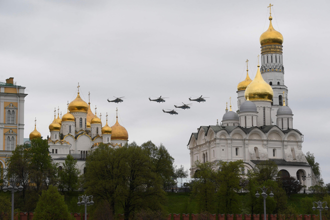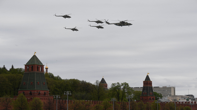En el desfile en la Plaza Roja de Moscú, participan 75 aeronaves, y fue inaugurado por helicópteros, entre ellos el más pesado de los helicópteros militares Mi-26, seguido por cuatro Mi-8AMTS multipropósito, helicópteros de ataque Mi-35M, varios Ka-52 y cinco helicópteros Mi-28N.