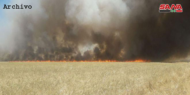 Bombas térmicas lanzadas por avión del ocupante estadounidense provocaron incendios en cultivos de trigo, en la provincia de Hasakeh.
