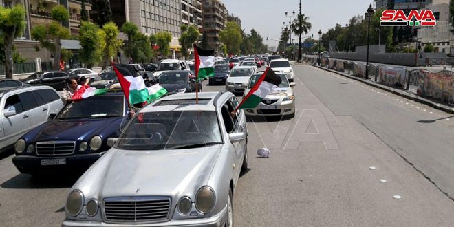 Los automóviles y los participantes llevaron banderas de Palestina y Siria, mientras se colocaron pancartas con frases que reafirman el arabismo de Palestina y que Jerusalén es su capital eterna, y también la resistencia es el único camino hacia la liberación.