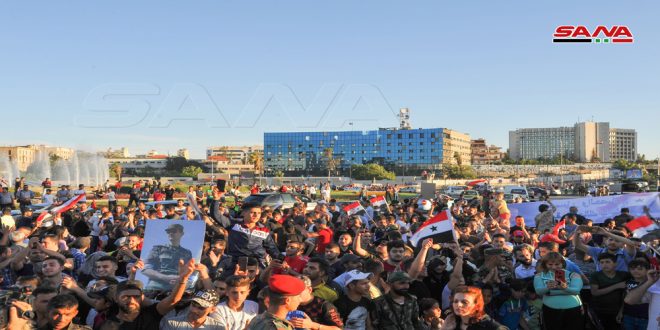 Una concentración popular tuvo lugar hoy en la plaza Omeya de la capital Damasco para denunciar la llamada “Ley César”, rechazar las injustas medidas coercitivas unilaterales impuestas a Siria y reafirmar el apego a los principios nacionales y a la unidad para hacer frente al terrorismo y la guerra económica.
