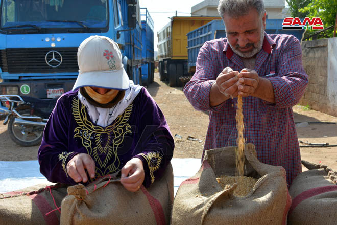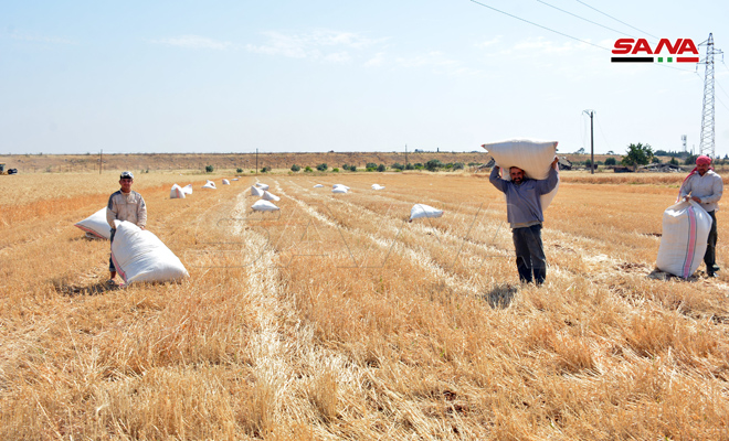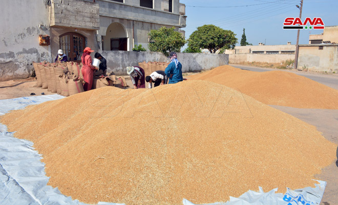 Los agricultores de la provincia central de Homs celebran la abundante y esperanzadora cosecha de trigo y cebada este año y comenzaron la entrega de sus cereales a los centros de la Empresa de Producción de Semillas.