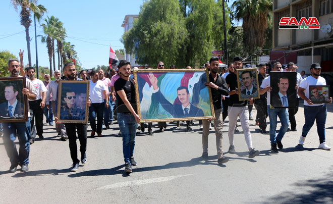 Una manifestación popular tuvo lugar hoy en la plaza Tishreen en la ciudad de Deraa, capital de la provincia con mismo nombre, para protestar contra la injusta guerra económica desatada por los enemigos contra el pueblo sirio.