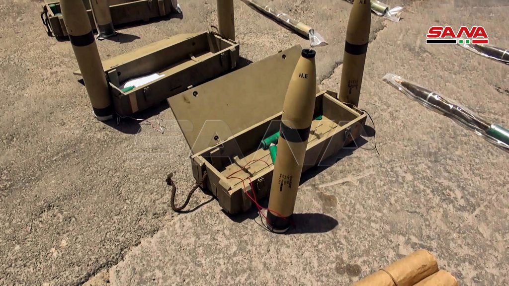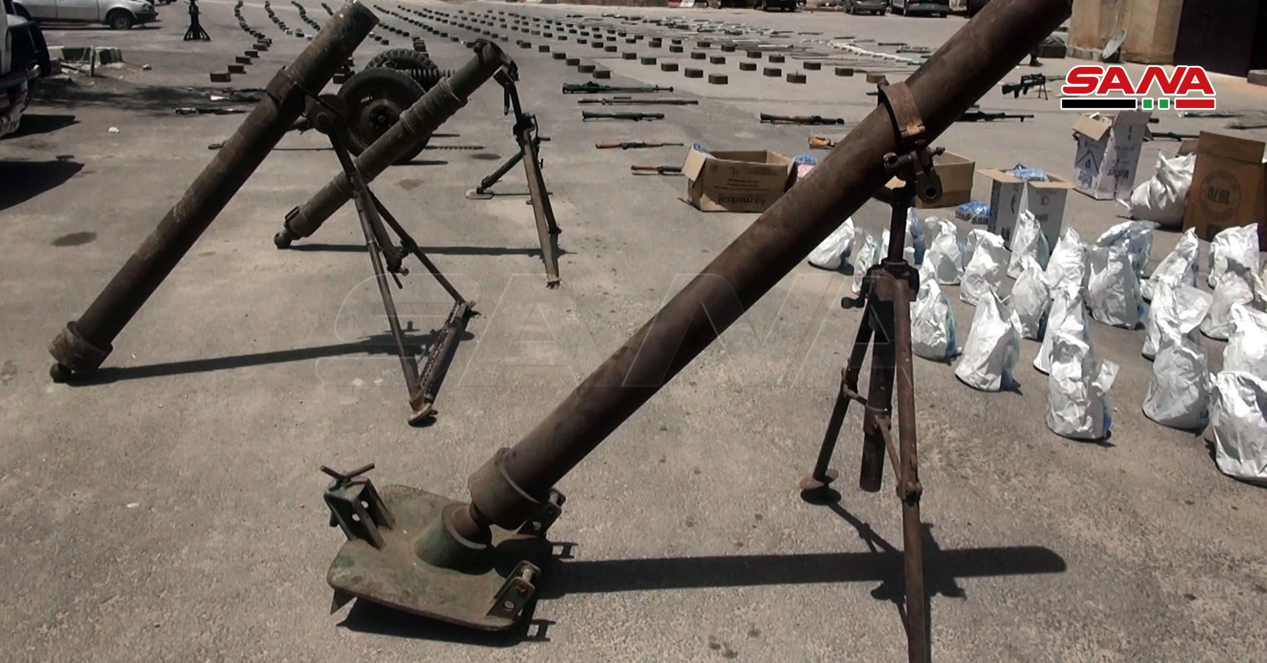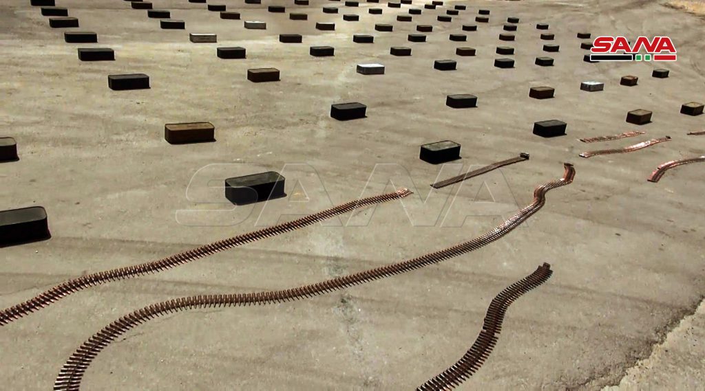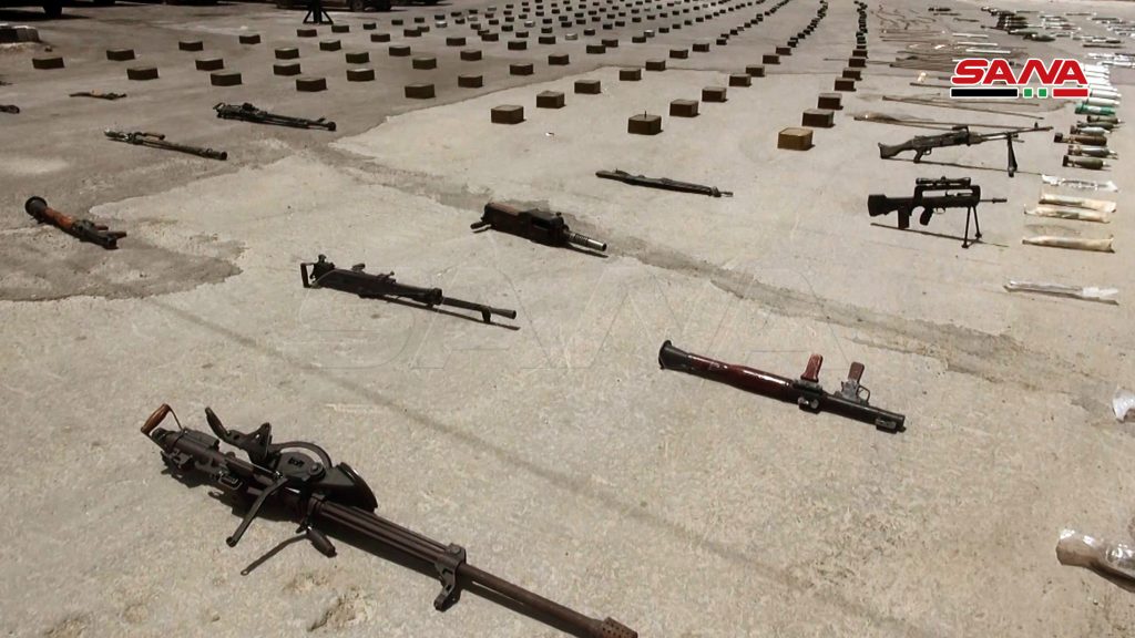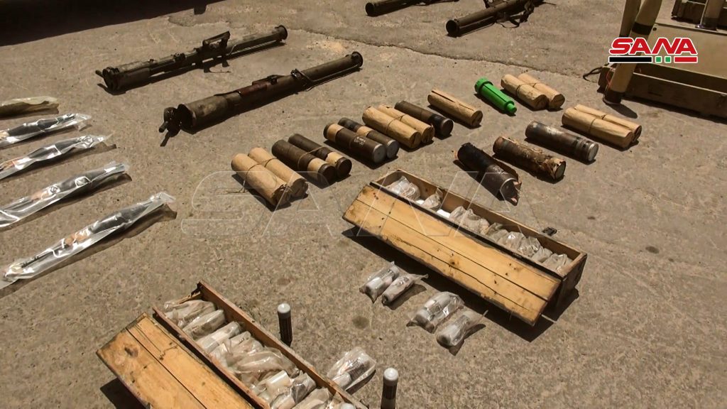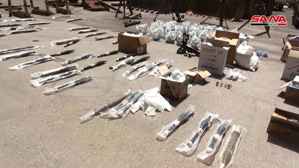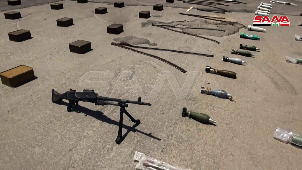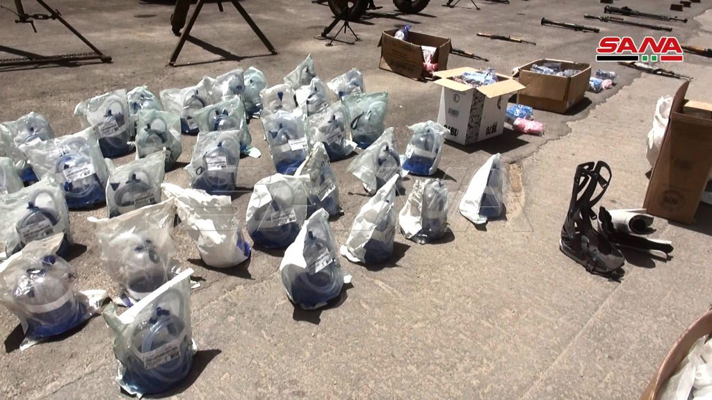 Una fuente militar citada por el reportero de SANA, indicó que el material fue incautado durante los operativos de peinado en las zonas liberadas, e incluye fusiles M-16 y fusiles de francotiradores de fabricación estadounidense, además de proyectiles RPG, morteros de diferentes calibres, y una camioneta 4×4 equipada con ametralladora pesada.